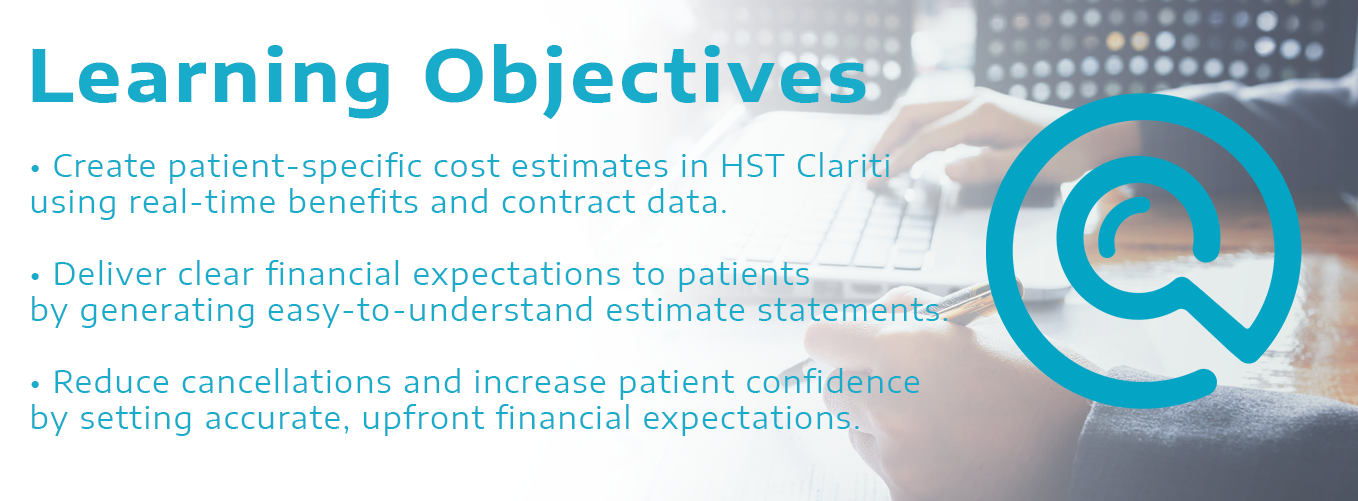 Description: In today’s healthcare environment, patients expect transparency about costs before their procedure. In this Webinar session, we’ll explore how HST Clariti helps your center deliver highly accurate estimates—up to 98%—so patients know what to expect financially. You’ll see how HST Clariti simplifies pre-service collections, reduces last-minute cancellations, and builds trust by eliminating billing surprises. By setting clear expectations upfront, your team can improve patient satisfaction, accelerate cash flow, and keep your center financially strong.